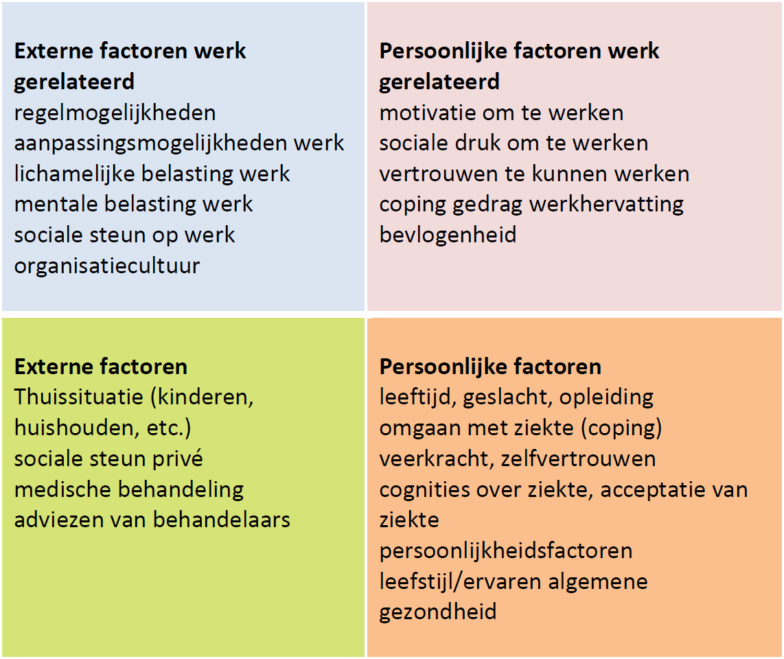 Het gaat bij persoonlijke factoren dus om de feiten én de beleving, zowel arbeids- als niet-arbeidsgerelateerd. Het gaat bij externe factoren ook om de feiten én beleving, zowel arbeids- als niet-arbeidsgerelateerd.