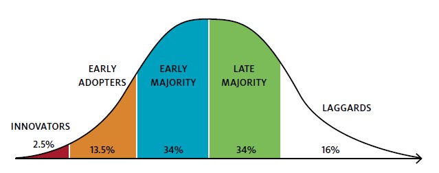 Voor het onderzoek zijn de arbeidsdeskundigen gevraagd om zichzelf te positioneren op de onderstaande bell curve. Daarmee geven zij aan hoe zij aankijken tegen nieuwe technologieën, in dit geval specifiek beeldbellen. Uit onderstaande bell curve blijkt dat de meeste arbeidsdeskundigen vinden dat ze zelf verwelkomend tegenover nieuwe technologieën staan. Slechts een enkeling plaatst zichzelf bij de laggards. Voor onze resultaten betekent dit dat er waarschijnlijk een oververtegenwoordiging is van mensen die nieuwe technologieën graag uitproberen en (ruime) ervaring hebben opgedaan met beeldbellen.