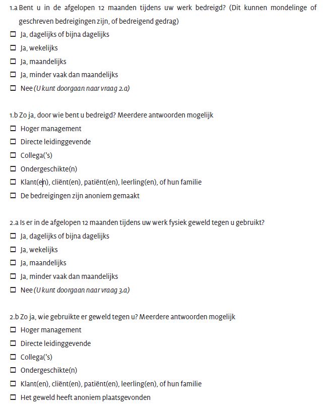 Voor u ligt de vragenlijst die het psychosociale werkklimaat in kaart brengt. Met ‘psychosociaal werkklimaat’ wordt bedoeld: de organisatie en inhoud van uw werk, de eisen die op het werk gelden, relaties met uw collega’s en het management, conflicten op het werk en de beleving van de werksituatie.