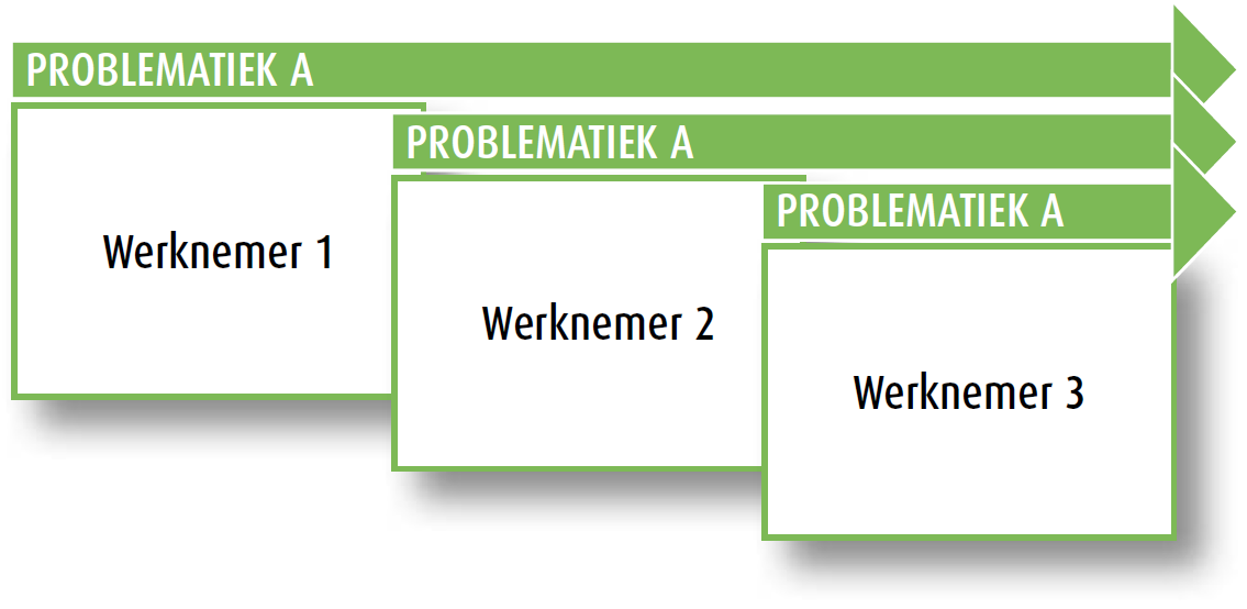 Figuur S.4 illustreert hoe de dienstverlening aan individuele werknemers overstijgende inzichten kan geven voor dienstverlening op groeps- of bedrijfsniveau. Weliswaar betreft het in dit voorbeeld verschillende werknemers, hun problematiek is hetzelfde en alle pijlen wijzen dan ook dezelfde kant op.