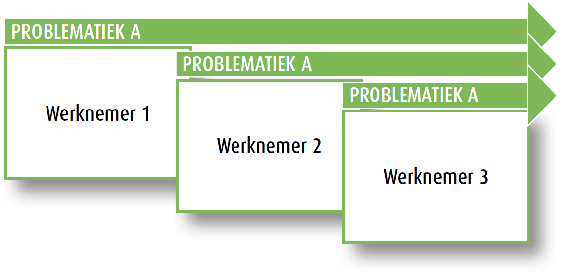 Figuur 5.3 illustreert hoe een arbeidskundige op basis van de dienstverlening aan individuele werknemers, overstijgende inzichten kan krijgen. En hoe hij/zij die inzichten voor dienstverlening op groeps- of bedrijfsniveau kan gebruiken. In het voorbeeld zien we dat verschillende werknemers dezelfde problematiek hebben. Alle pijlen wijzen dan ook dezelfde kant op.