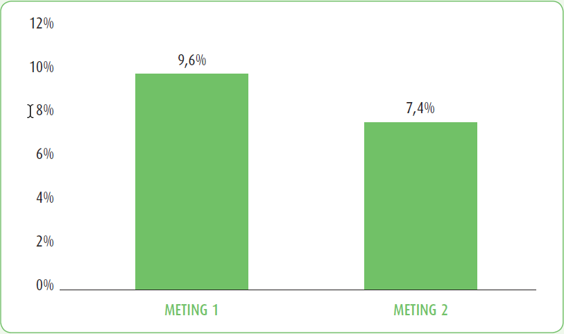 Voor de werkenden die deelnamen aan de voorliggende evaluatie en die een werkscangesprek voerden, is berekend wat het productiviteitsverlies was ten tijde van meting 1 en ten tijde van meting 2. Hierbij is gebruikgemaakt van de resultaten van wetenschappelijk onderzoe,k waarin de samenhang tussen WAI-score en productiviteit is vastgesteld.4 Volgens deze berekeningen was het productiviteitsverlies ten tijde van meting 1 9,6 procent en bij meting 2 7,4 procent. Zie hiervoor ook figuur 13.