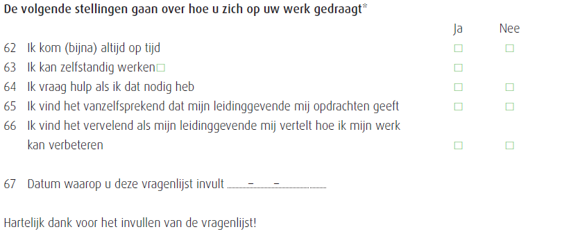 Neem rustig de tijd om de vragen te beantwoorden. Bij deze vragenlijst kunt u geen goede of foute antwoorden geven. Het gaat om uw eigen mening en beleving. Als u twijfelt, kies dan het antwoord dat het meeste bij uw past.