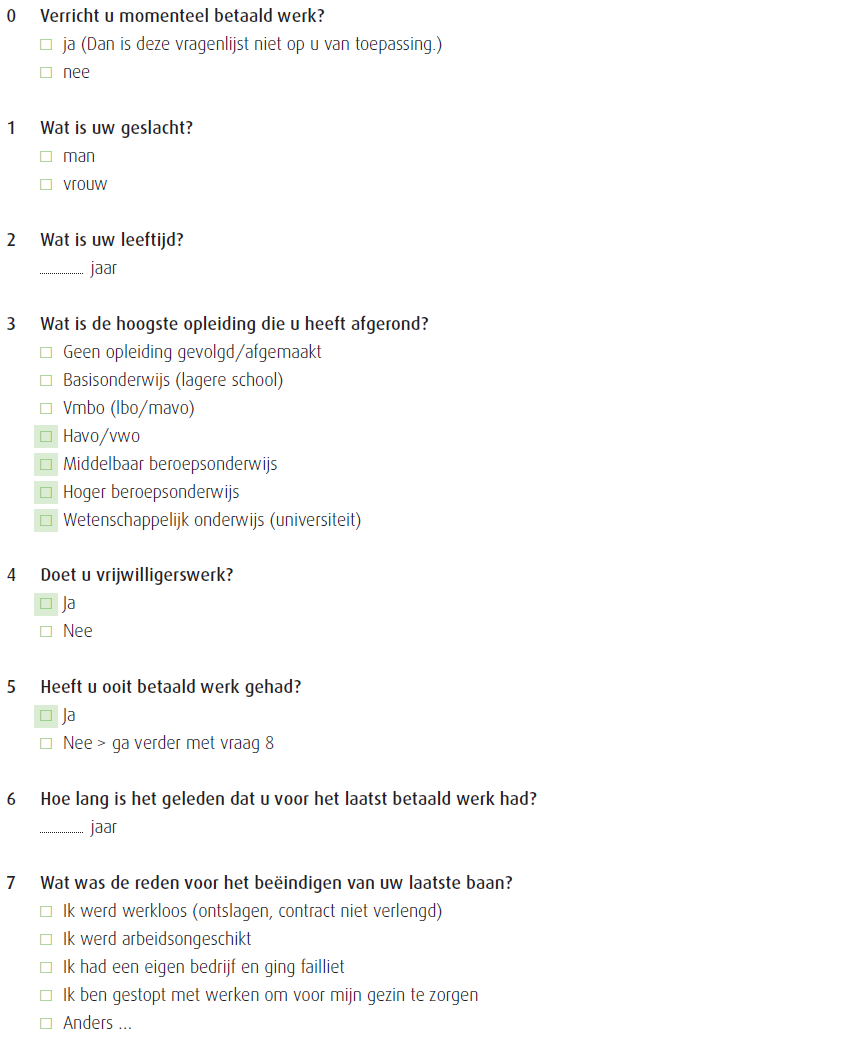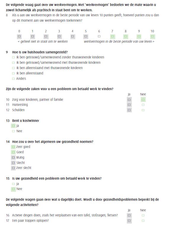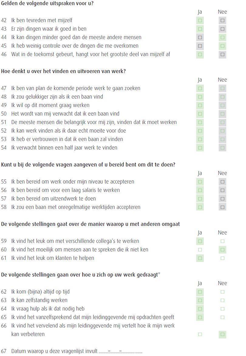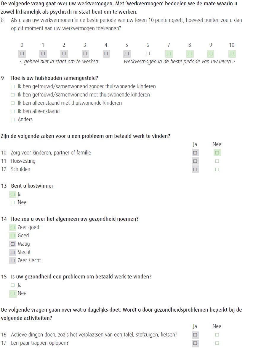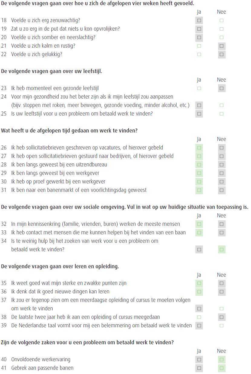 De antwoorden van de cliënt vult u in op het Scoreformat. U doet dit wanneer de cliënt er niet bij is. In het Scoreformat zijn de verschillende antwoordcategorieën gemarkeerd. Grijs gemarkeerde antwoorden duiden op een versterkende factor, groen gemarkeerde op een belemmerende. Soms is alleen een combinatie van antwoorden een signaal voor een versterkende of belemmerende factor. Daarom moet u dit Scoreformat altijd verwerken in het Resultatenverslag (zie bijlage 3).