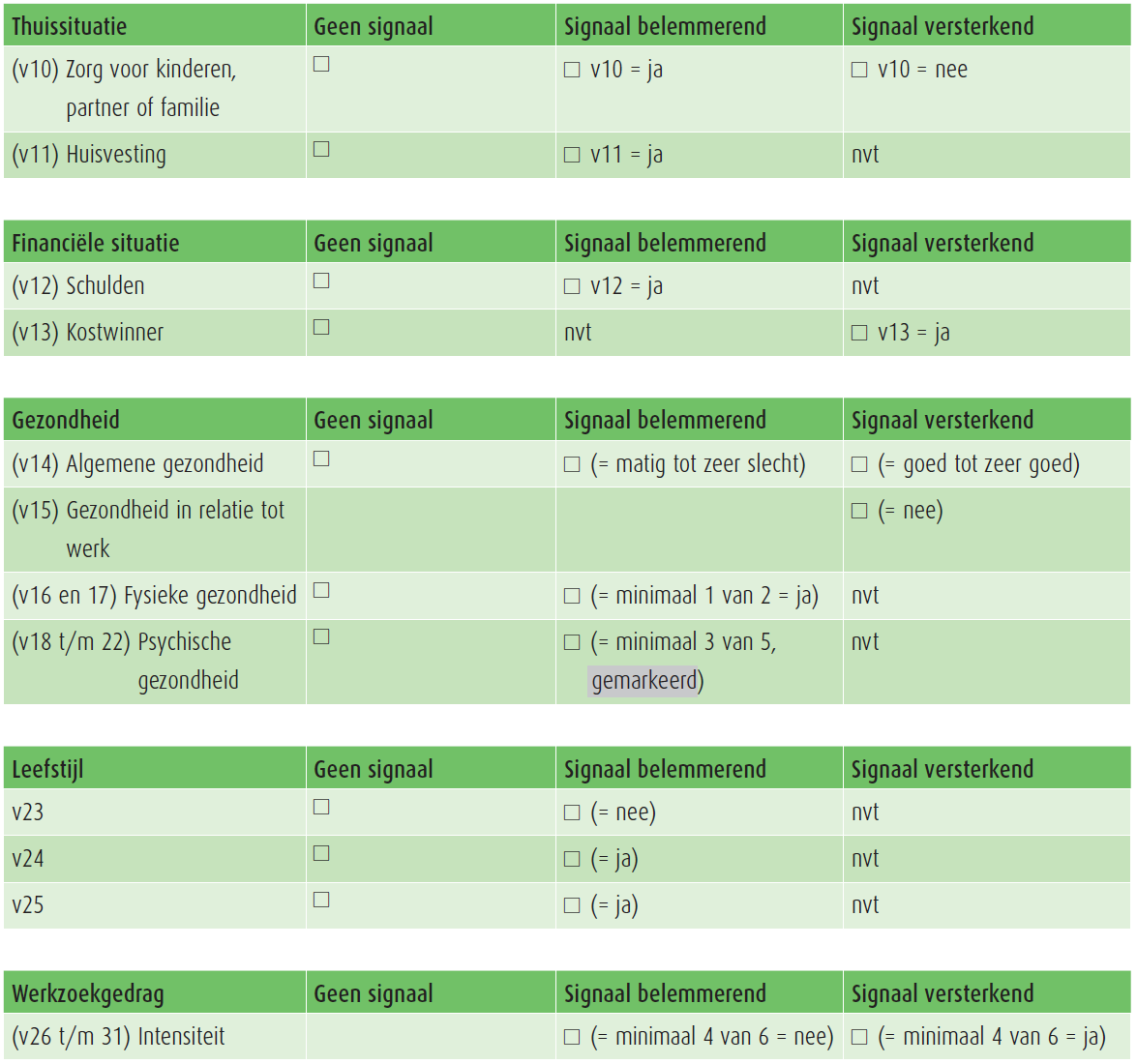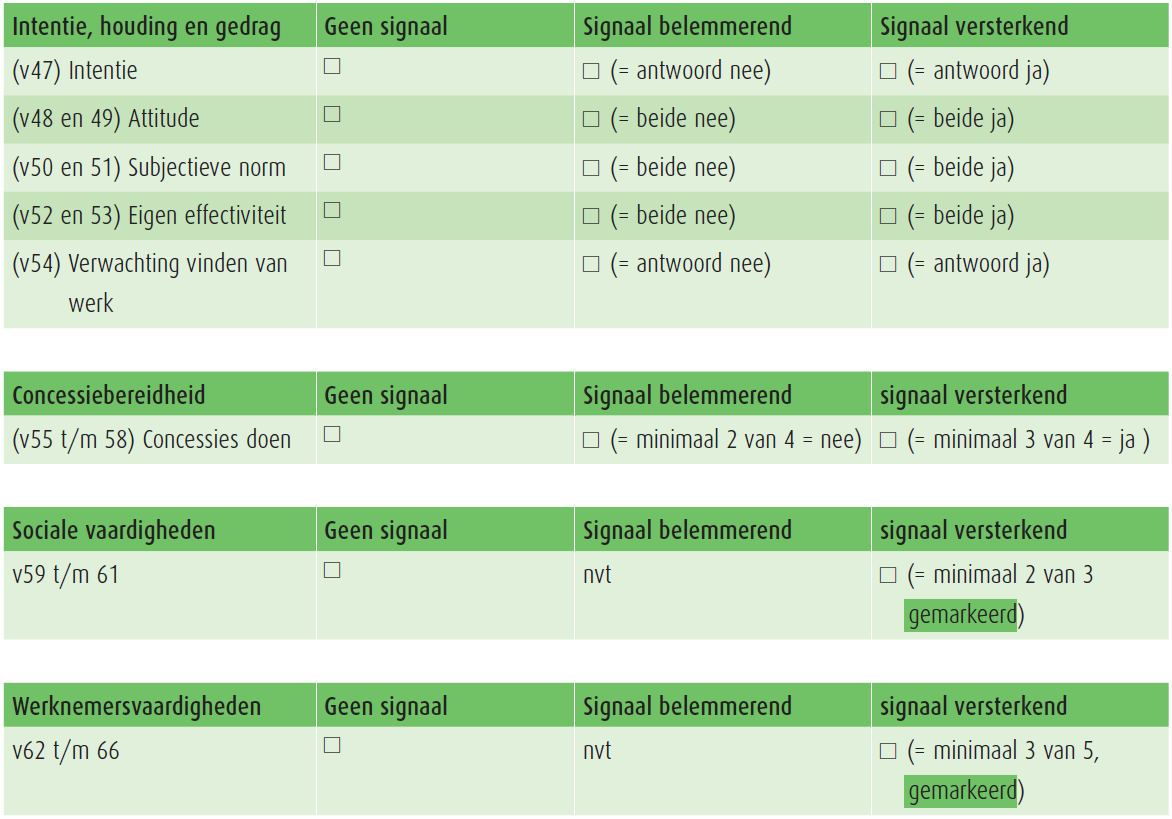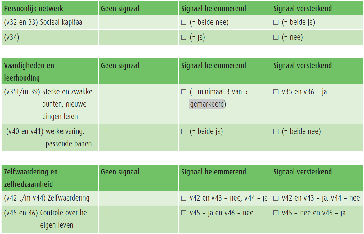 Per onderdeel kunt u, op basis van het Scoreformat, in dit Resultatenverslag aangeven of er op dit onderdeel een versterkende of belemmerende factor is. In de tabellen staat welke vraag of vragen bij een onderdeel horen en welke (combinatie van) gemarkeerde antwoorden leiden tot een versterkend of belemmerend signaal.