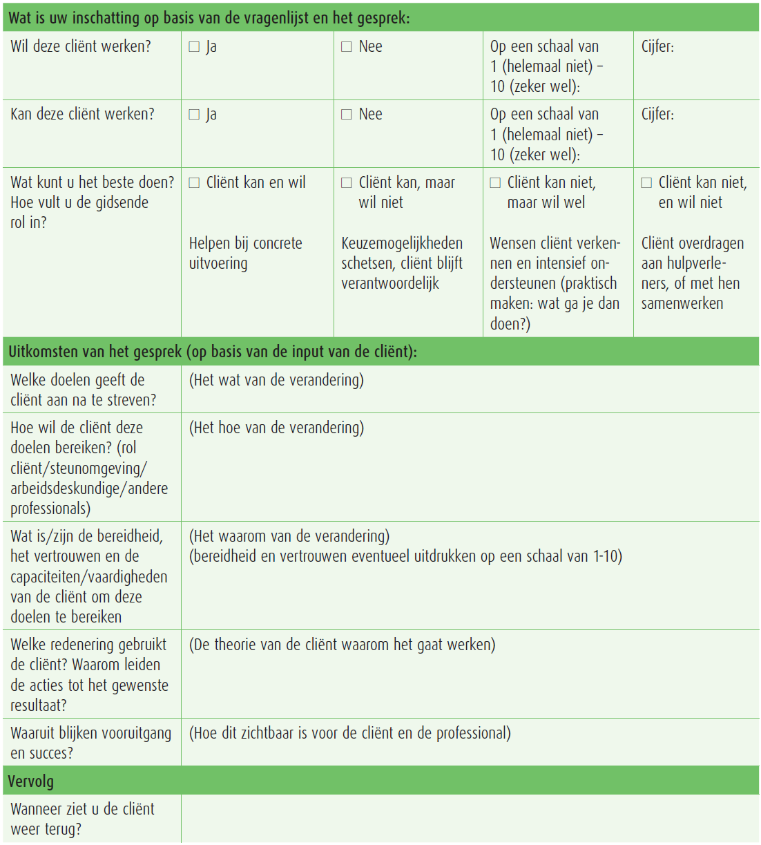 Dit schema is de start voor het verdere traject van de cliënt, waarin u bepaalt hoe u uw rol als gids in het begeleidingstraject gaat invullen. Doe dit door onderstaand schema in te vullen. Dit schema is dus uw eigen plan van aanpak. Gebruik voor de cliënt het verslag van de Scan Werkvermogen Werkzoekenden.