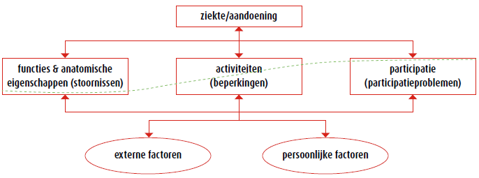 Dit schema geeft de samenhang weer van de mogelijkheden om te participeren (functioneren) in relatie tot de externe en persoonlijke factoren.