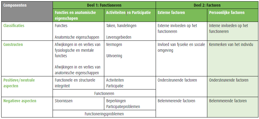Het ICF-schema bestaat feitelijk uit twee onderdelen, die allebei twee componenten hebben:
