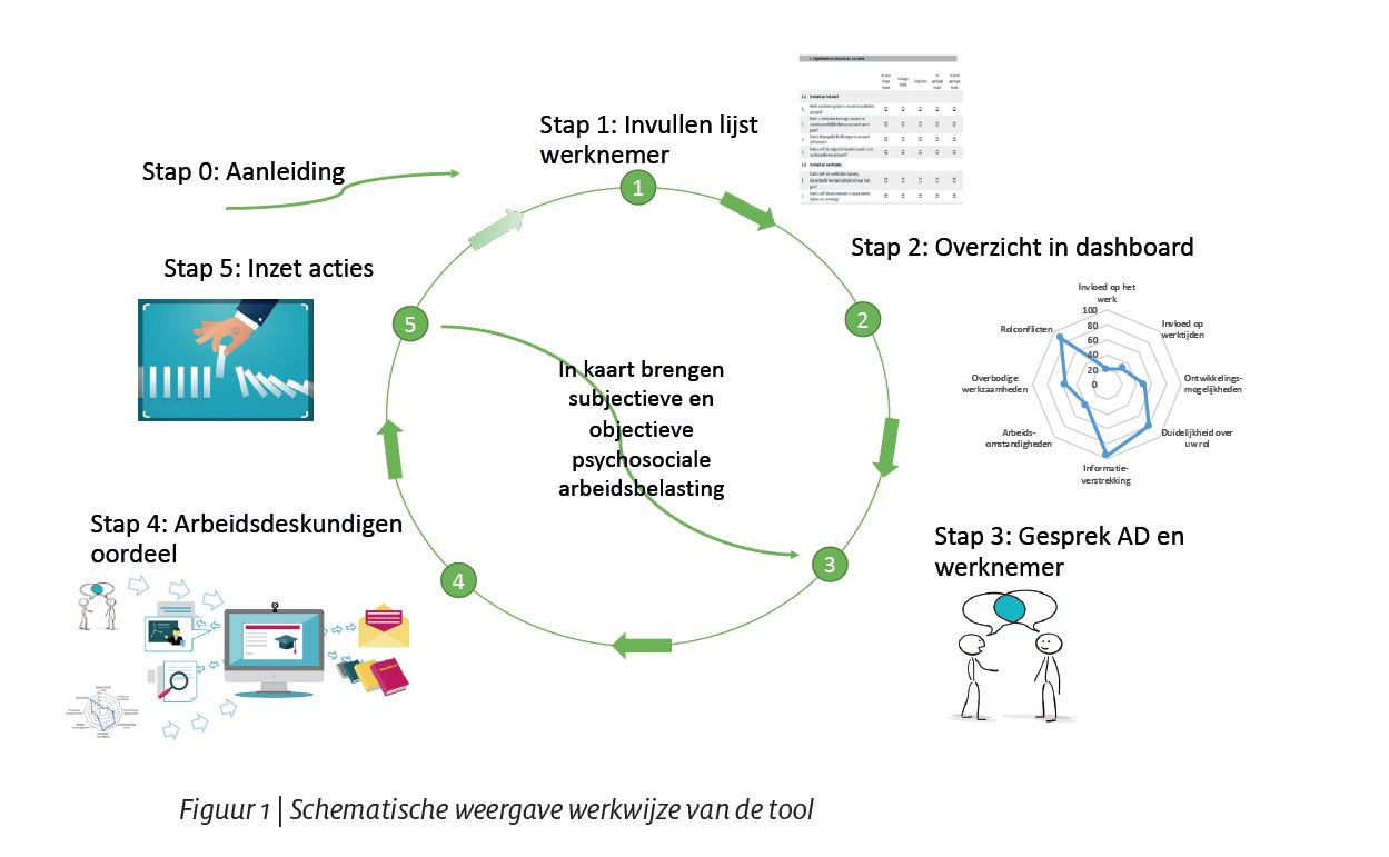 In dit hoofdstuk wordt de opzet en inhoud van de ontwikkelde ‘Tool arbeidsdeskundige beoordeling psychosociale arbeidsbelasting’ toegelicht. De met arbeidsdeskundigen ontwikkelde ‘Tool arbeidsdeskundige beoordeling psychosociale arbeidsbelasting’ – hierna aangeduid als ‘de tool’ – is gebaseerd op de naar de Nederlandse context cross-cultureel vertaalde en aangepaste versie van de Deense psychosociale arbeidsomstandigheden vragenlijst (zie Hoofdstuk 4). Deze vragenlijst is geschikt om uit te zetten bij groepen werknemers om zo het psychosociale werkklimaat op afdelings- of organisatieniveau te meten. Voor het gebruik van de vragenlijst in de dagelijkse praktijk van arbeidsdeskundigen bij individuele werknemers is een werkwijze ontwikkeld (zie Hoofdstuk 5). Figuur 1 geeft een schematische weergave van de werkwijze van de tool.