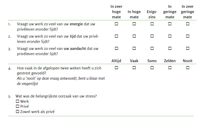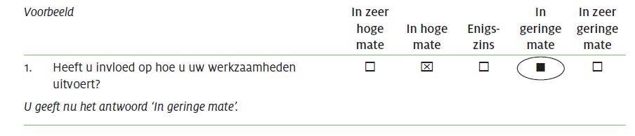Het invullen van de vragenlijst kost u ongeveer 30 minuten. Het is belangrijk dat u de vragen zo eerlijk mogelijk beantwoordt, en uw eigen mening geeft. Uw antwoorden zijn dus niet goed of fout. Denk niet te lang over de antwoorden na; de eerste ingeving is meestal het beste antwoord. Het is belangrijk dat u de vragenlijst helemaal invult. Ook als u een vraag onbelangrijk vindt of er misschien geen mening over heeft, probeer dan toch een antwoord te kiezen dat het best bij uw situatie past. Indien u meerdere banen heeft, vul de vragenlijst dan in voor de baan met de meeste uren.