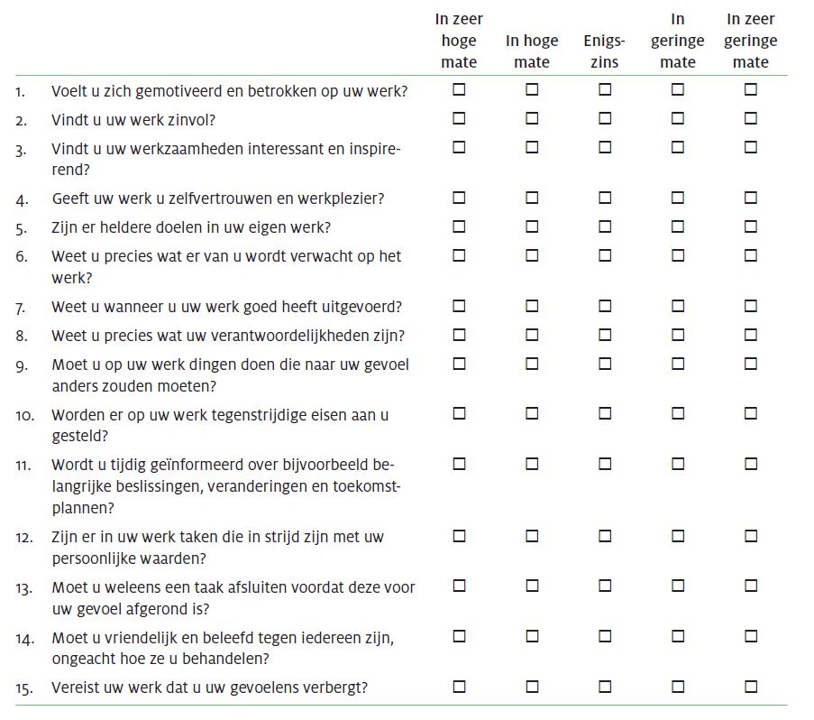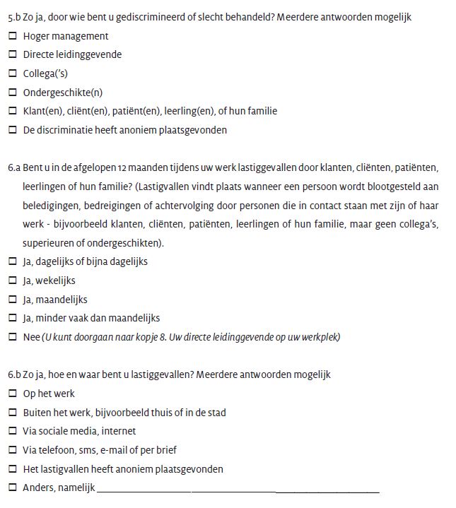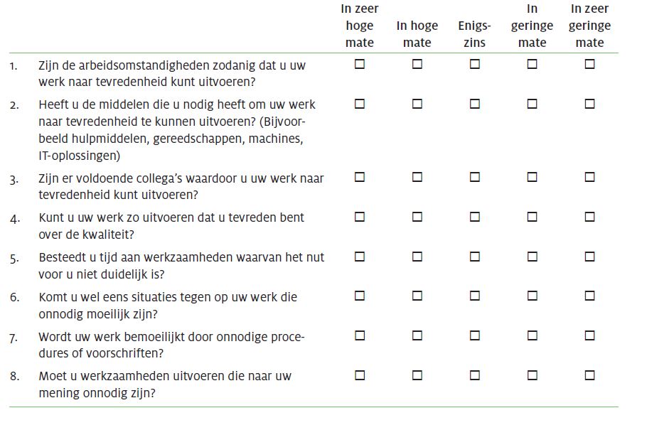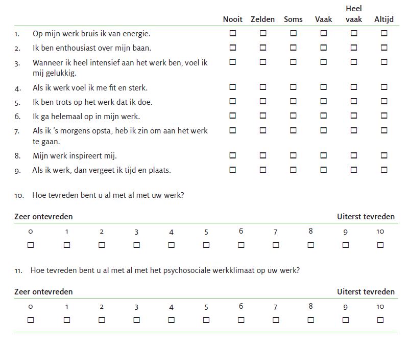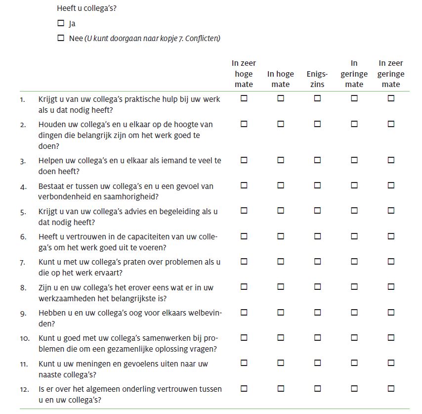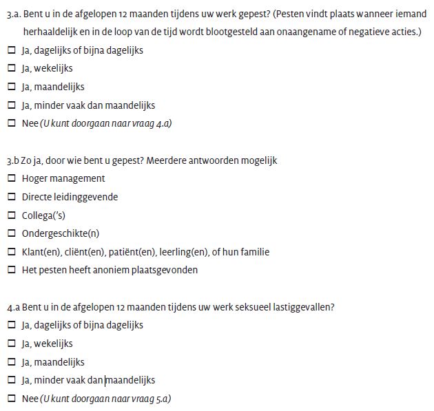 Voor u ligt de vragenlijst die het psychosociale werkklimaat in kaart brengt. Met ‘psychosociaal werkklimaat’ wordt bedoeld: de organisatie en inhoud van uw werk, de eisen die op het werk gelden, relaties met uw collega’s en het management, conflicten op het werk en de beleving van de werksituatie.