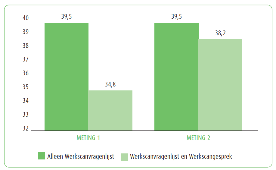 De figuur laat zien dat de groep die alleen de vragenlijst heeft ingevuld, bij meting 2 dezelfde WAI-score heeft als ten tijde van meting 1, en dat de groep die daarnaast ook het gesprek heeft gevoerd – en het volledige Werkscanproces heeft doorlopen – een duidelijke toename van de WAI-score laat zien. Bij de groep die een gesprek heeft gehad met de Werkscandeskundige is de WAI-score gemiddeld met 3,4 punten toegenomen. We kunnen niet vaststellen of deze WAI-toename veroorzaakt wordt door het Werkscangesprek of dat er (deels) andere zaken aan ten grondslag liggen, zoals verbeterde gezondheid of activiteiten gericht op het verbeteren van werkvermogen die de werkenden onafhankelijk van de Werkscan hebben ondernomen.