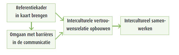 De basiscompetenties hangen met elkaar samen (zie ook figuur 2). Eerst moeten barrières in taal en cultuur worden weggenomen. Daarna kan er een vertrouwensrelatie ontstaan (Vink, 2009). Uit onderzoek van Verstraten e.a. (2006) komt naar voren dat obstakels in de communicatie het ontstaan van een vertrouwensrelatie in de weg staan en daarmee ook het ontstaan van een effectieve hulpverlenersrelatie tegengaan. Hierdoor komen sommige houdingsaspecten en vaardigheden bij meerdere basiscompetenties aan de orde.
