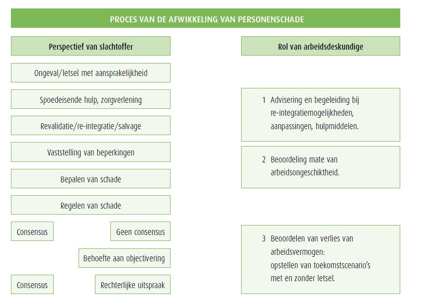 Figuur 1 Proces van de afwikkeling van personenschade; perspectief van het slachtoffer en de rol van de arbeidsdeskundige.