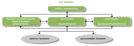 Dit schema geeft de samenhang weer van de mogelijkheden om te participeren (functioneren) in relatie tot de externe en persoonlijke factoren.