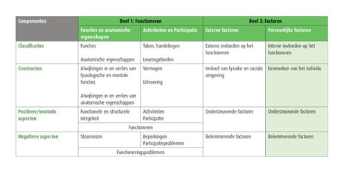 functioneren en functioneringsproblemen met de componenten ‘functies en anatomische eigenschappen’ en de componenten ‘activiteiten’ en ‘participatie’.