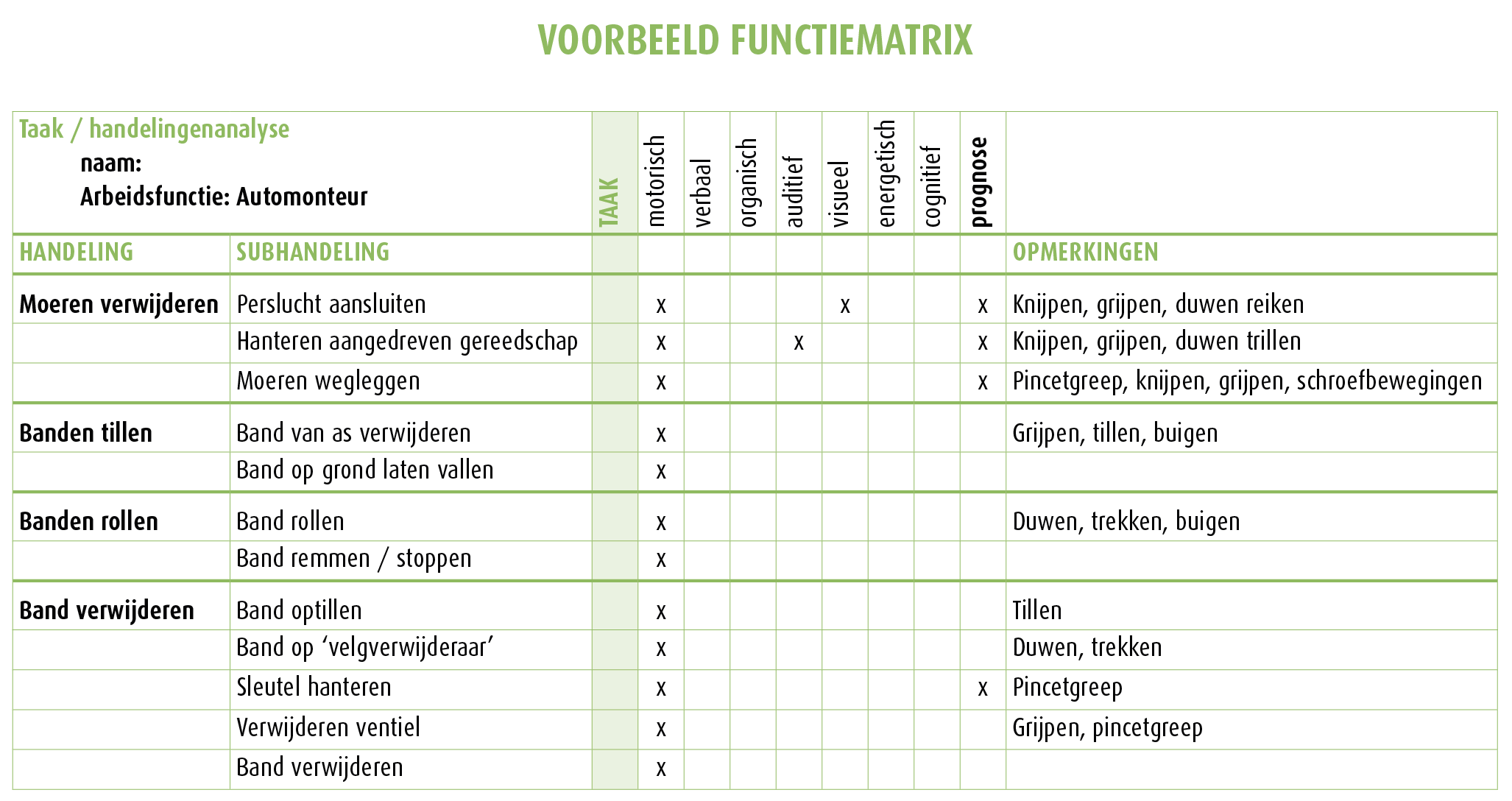 Voor het opstellen van een advies kan gebruik worden gemaakt van de taak-functieanalyse. Zoals beschreven in fase 1, onderdeel van de beeldvorming. Als voorbeeld is de functie van automonteur geanalyseerd en weergegeven in een functiematrix waarbij de deeltaak (het verwisselen van autoband) is weergegeven.