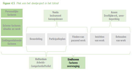 Door middel van dossieronderzoek heeft Team Eindhoven onderzocht welke factoren die in beeld komen in de concrete praktijk van het beoordelen van aanspraken op de Wajong in positieve of in negatieve zin samenhangen met de kans op arbeidsparticipatie. De relevantie voor de praktijk is dat een betere kennis van succes- en faalfactoren kan bijdragen aan het verbeteren van het systematisch handelen van arbeidsdeskundige en verzekeringsarts bij het beoordelen en vooral ook begeleiden van Wajongaanvragers met ASS. In dit deelproject hebben de onderzoekers zich gericht op het totale Wajongproces. In het schema wordt weergegeven met het vetgedrukte blauwe blokje. Zie figuur 4.5.