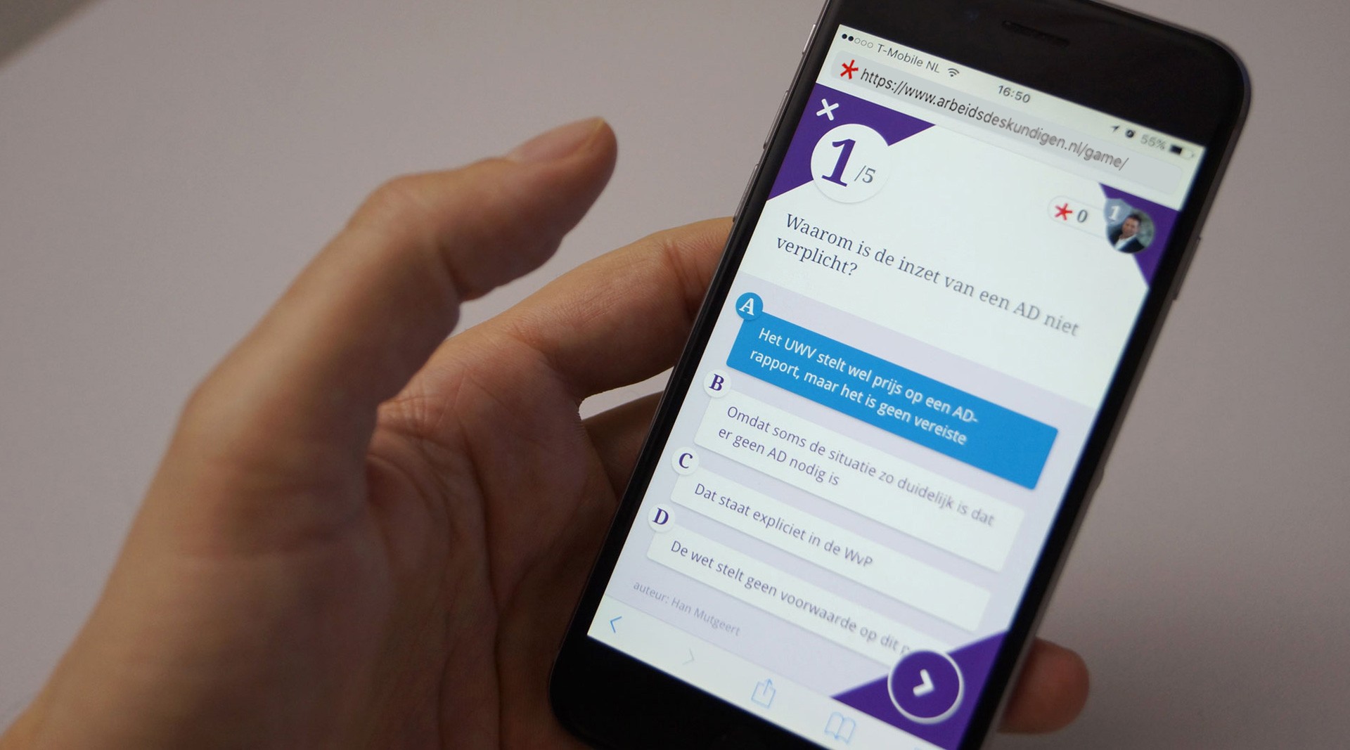 De AD-Game is een web game, die op de telefoon, tablet en laptop te spelen is. Blokjes van vijf vragen zorgen dat het spel snel en kort gespeeld kan worden. Na een blokje van vijf vragen kan de speler terugblikken op zijn antwoorden en worden er korte toelichtingen gegeven met achtergrondinformatie en links naar bronnen zoals pagina’s van de nieuwe Werkwijzer Poortwachter UWV 24 maart 2017. Het goede antwoord wordt niet prijsgegeven. Spelers krijgen alleen informatie over de richting van het goede antwoord. Alle vragen keren at random terug – ook de vragen die al een keer goed beantwoord zijn. Uiteraard zitten er in elk blokje vragen altijd enkele nieuwe vragen of vragen die nog niet goed zijn beantwoord.