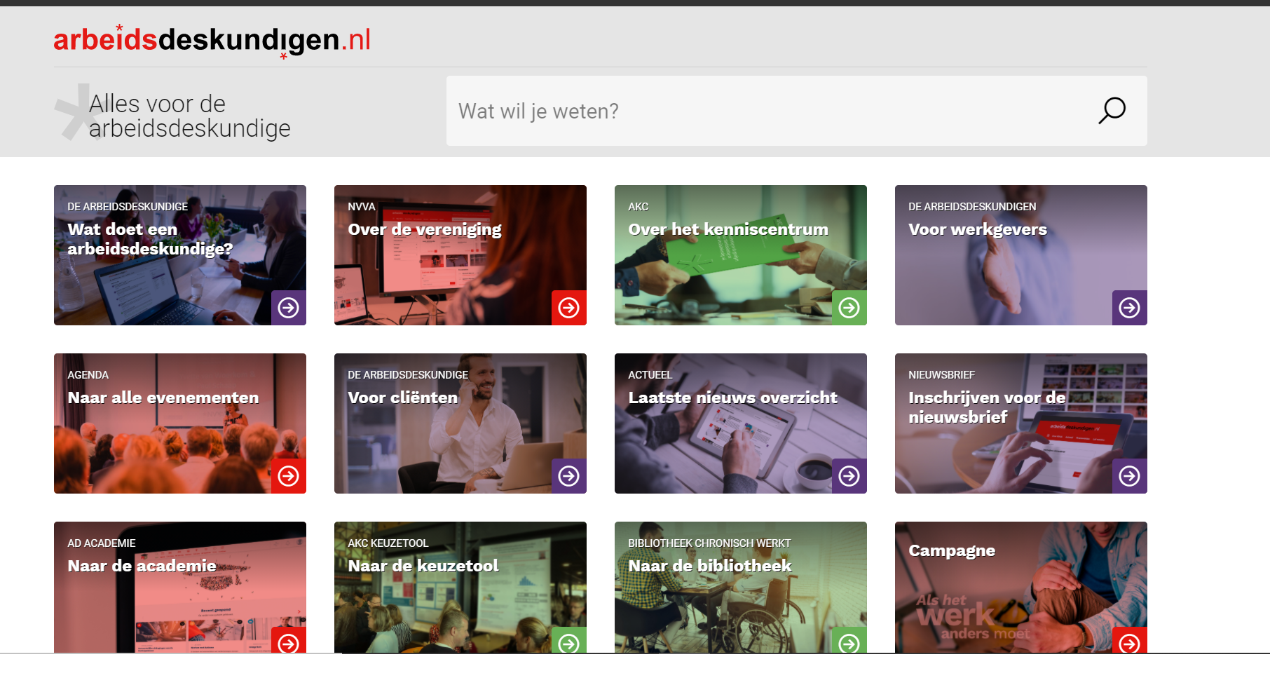 ‘Alles voor de arbeidsdeskundige’, is het motto van de geheel vernieuwde website arbeidsdeskundigen.nl. En daarmee is niets te veel gezegd: de site is super overzichtelijk én compleet. De homepage bestaat uit tegels die je direct leiden naar uiteenlopende thema’s of onderwerpen. Zo kun je in een muisklik naar kennis ove rhet vakgebied, wat doet een arbeidsdeskunide maar ook het laatste nieuws, evenementen, de AD Academie, de AKC kennisbank of het vrijwel complete digitale archief van AD Visie. Met dit portaal willen we alle kennis ontsluiten over het vakgebied. De Nederlandse Vereniging van Arbeidsdeskundigen (NVvA) en het Arbeidsdeskundig Kennis Centrum (AKC)